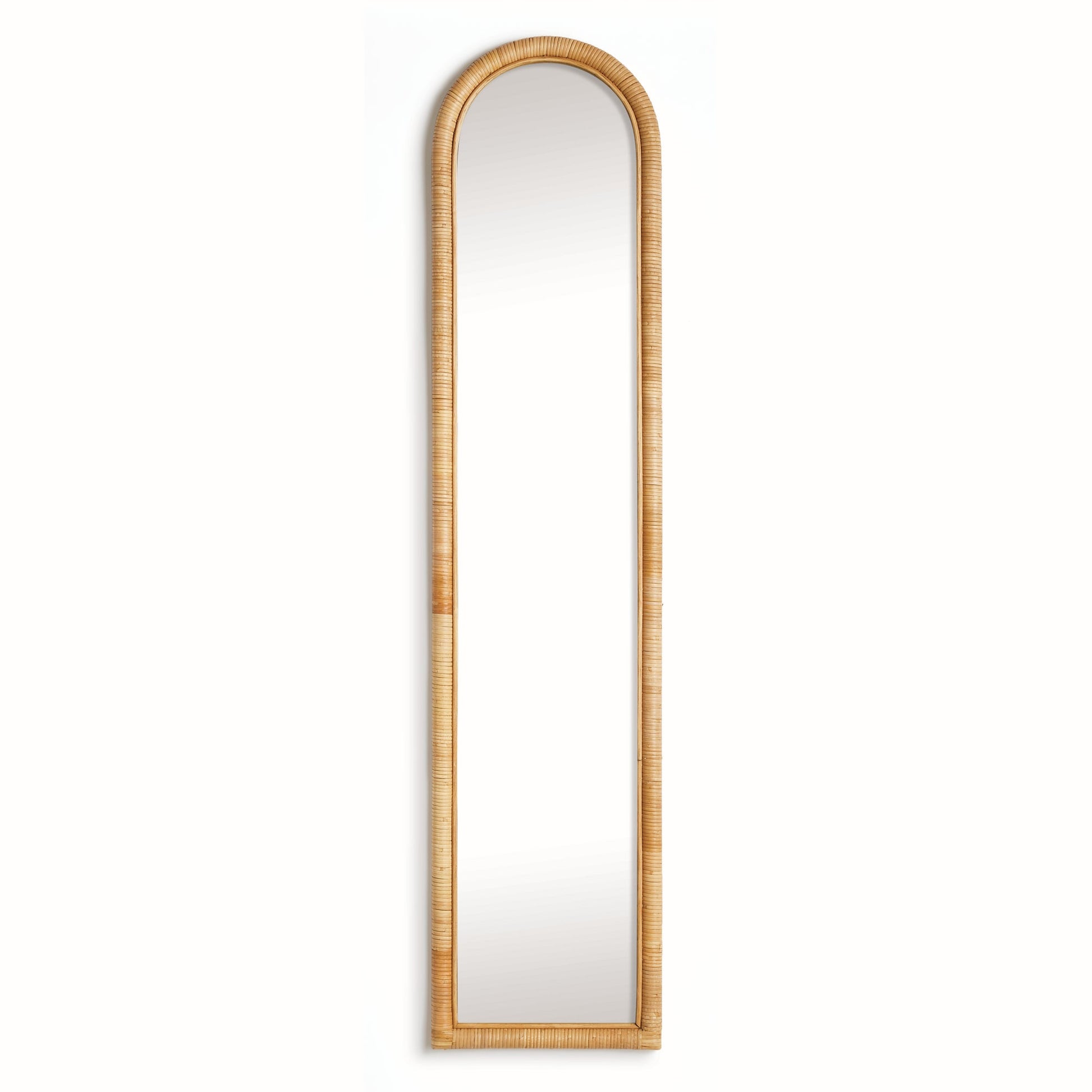 This rattan wrapped floor mirror with an arch design is a casual accent for the home or office. A dynamic look for entry, hallway or even primary closet.
