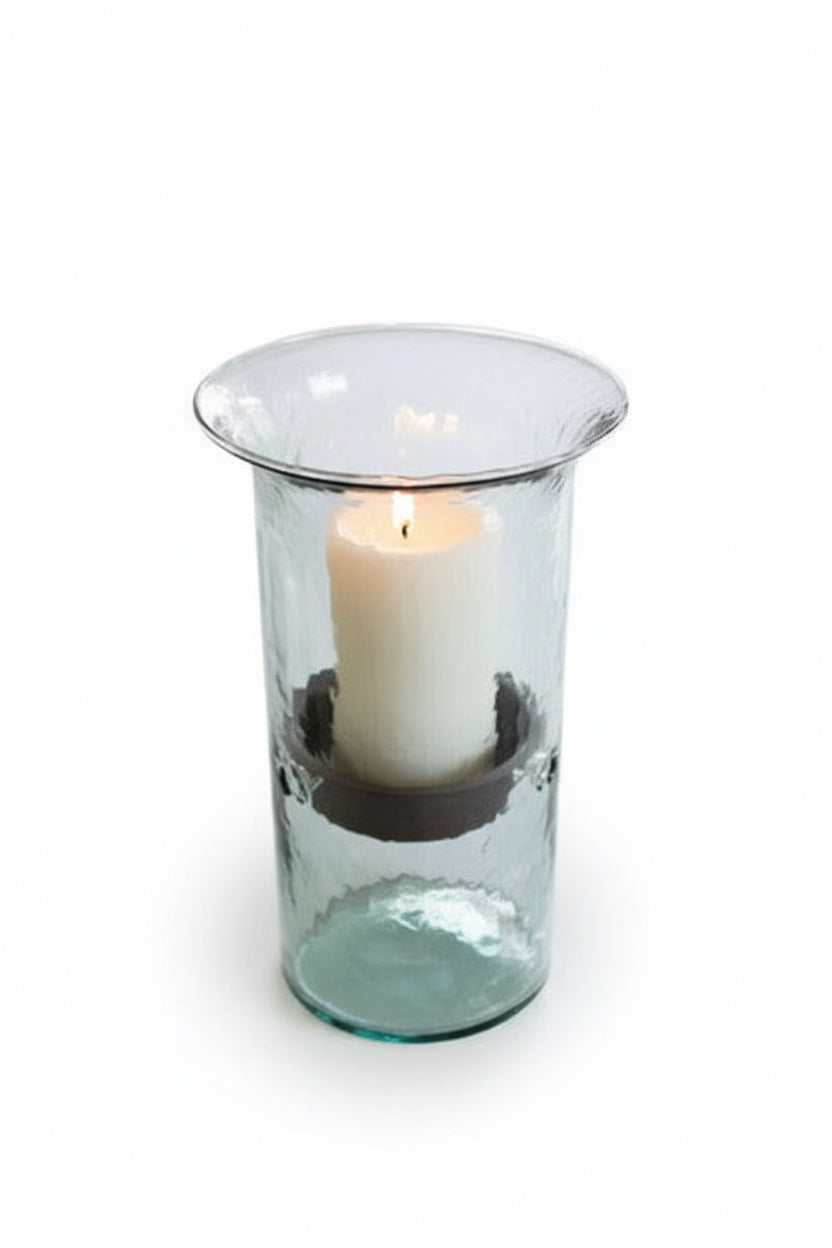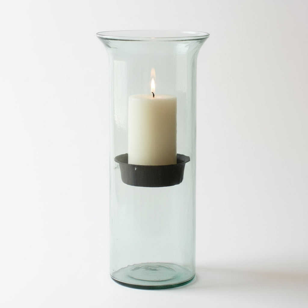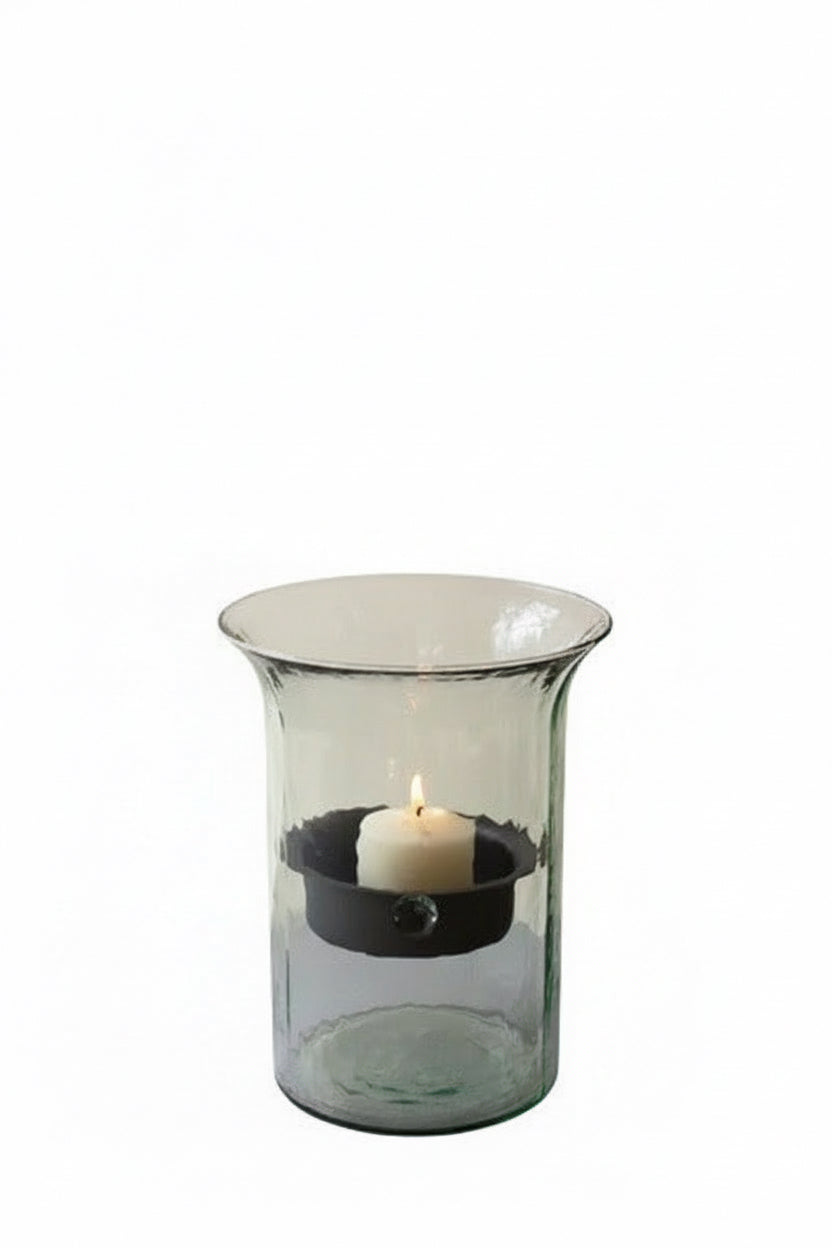 Hand blown Columbian glass has a rustic metal floating insert that can hold a 3" candle. Decorative items such as dried flowers, pinecones, or corks can be added to the bottom and changed for a seasonal look.